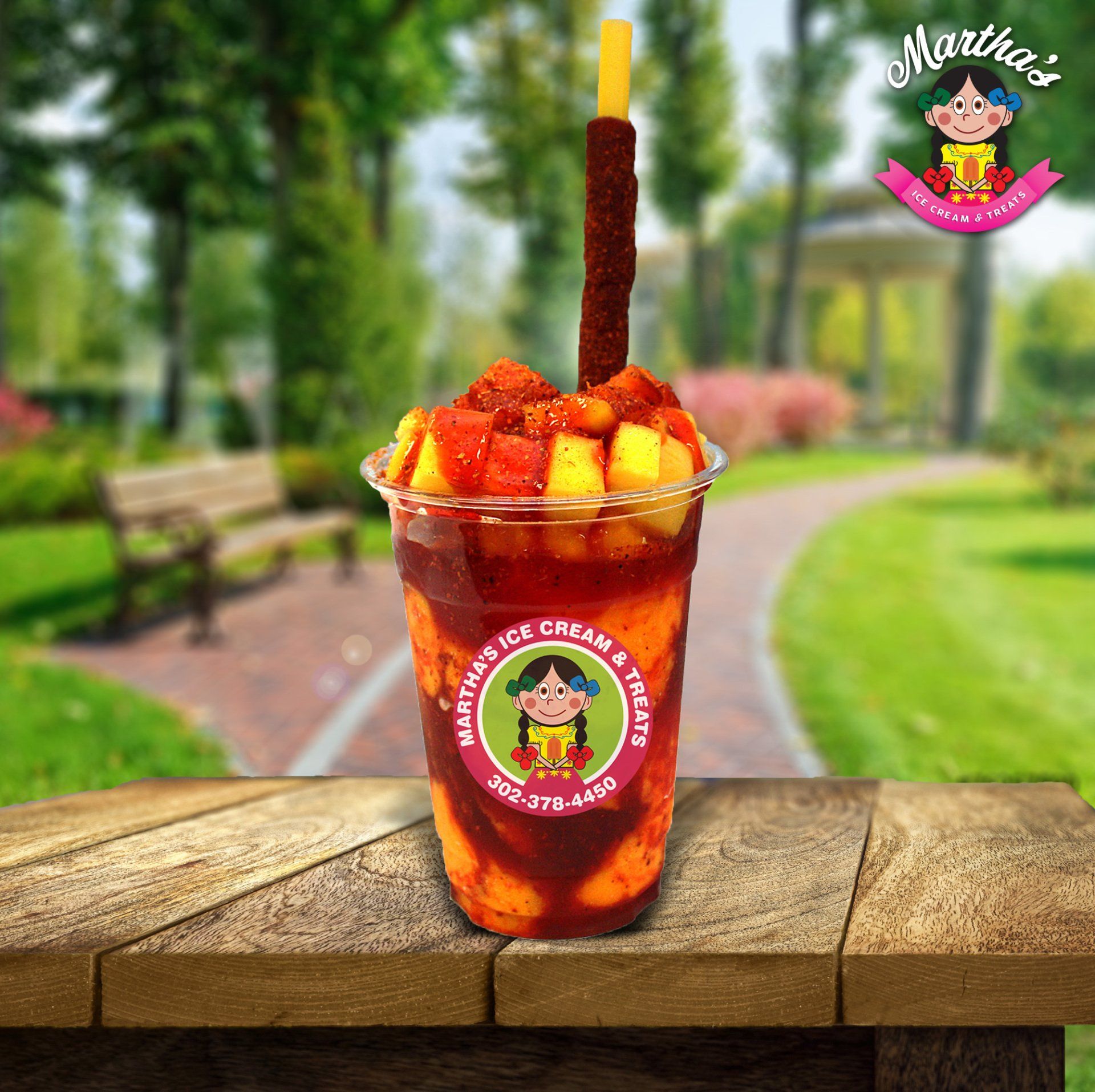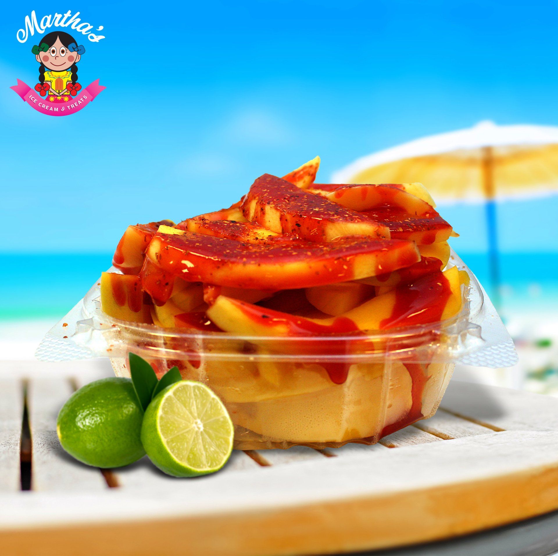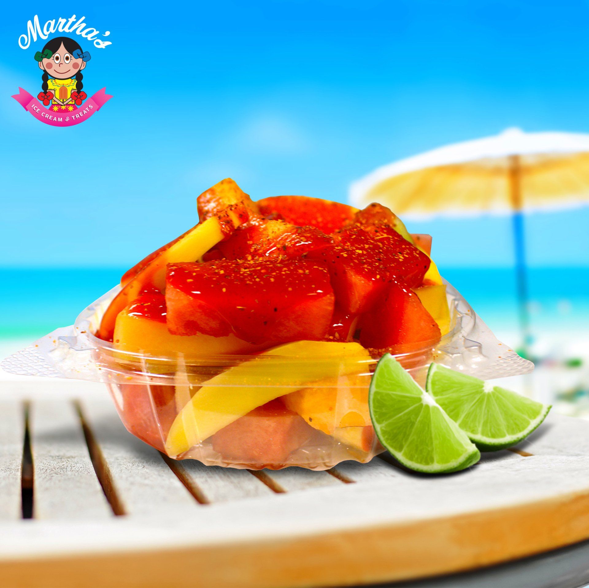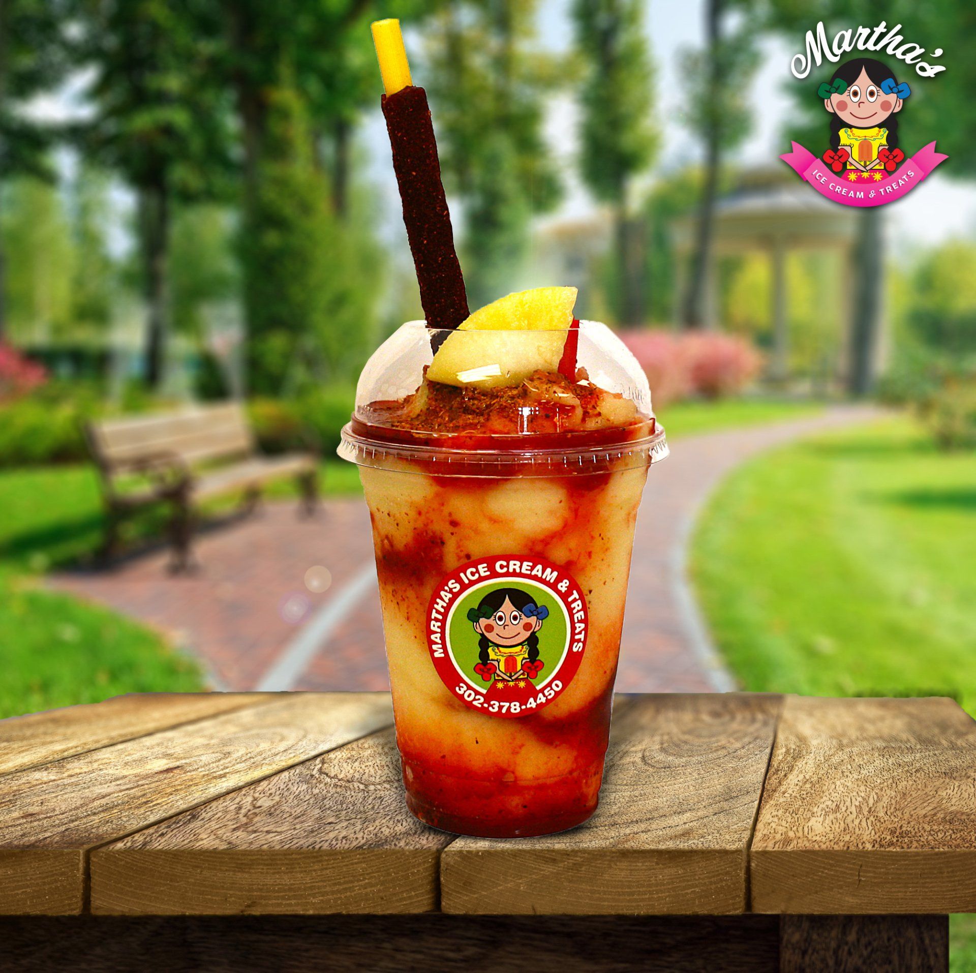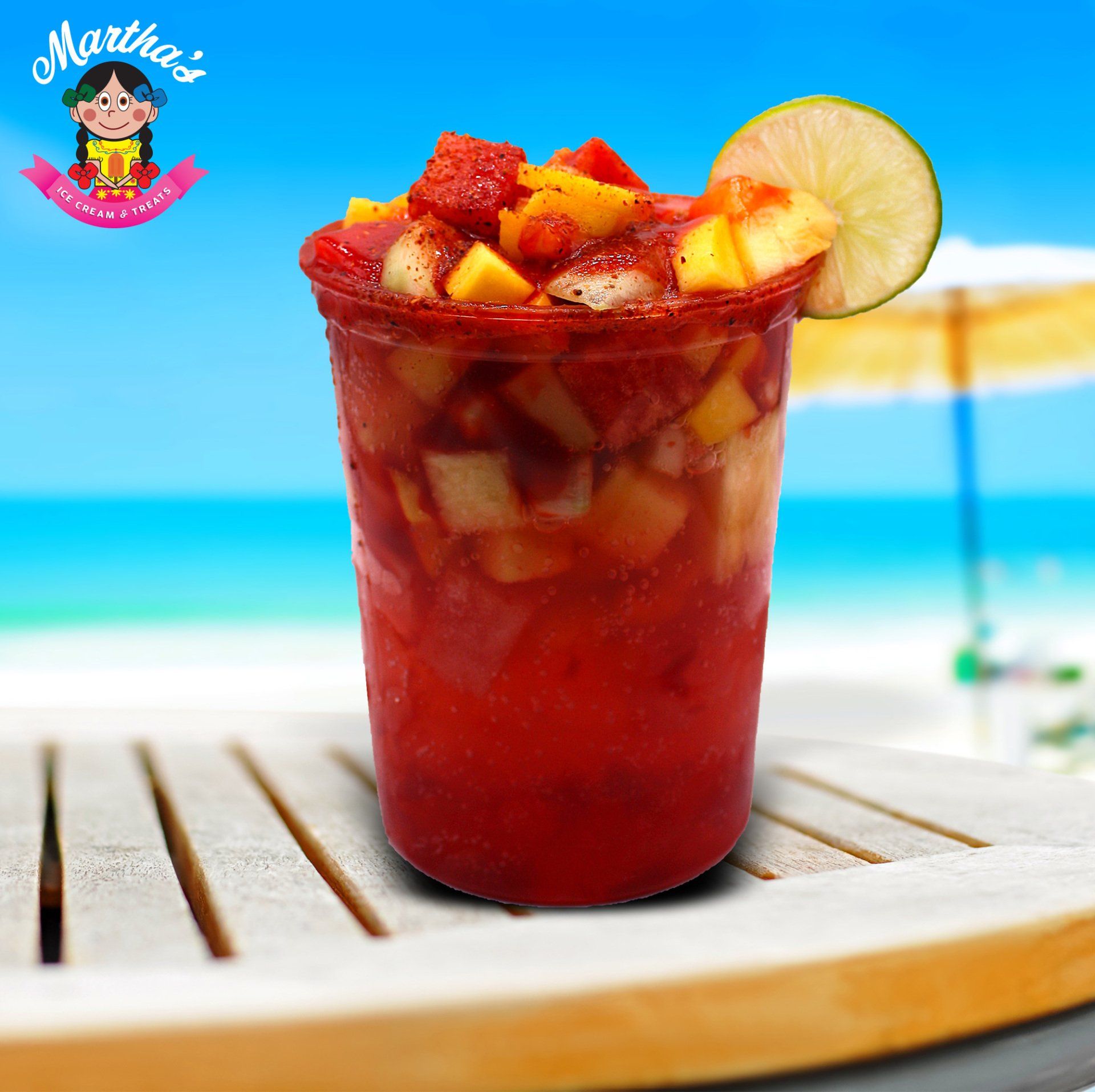 Hielo, pulpa de sabor a su gusto, chamoy, tajin, fruta fresca a su gusto, dulce de tamarindo.