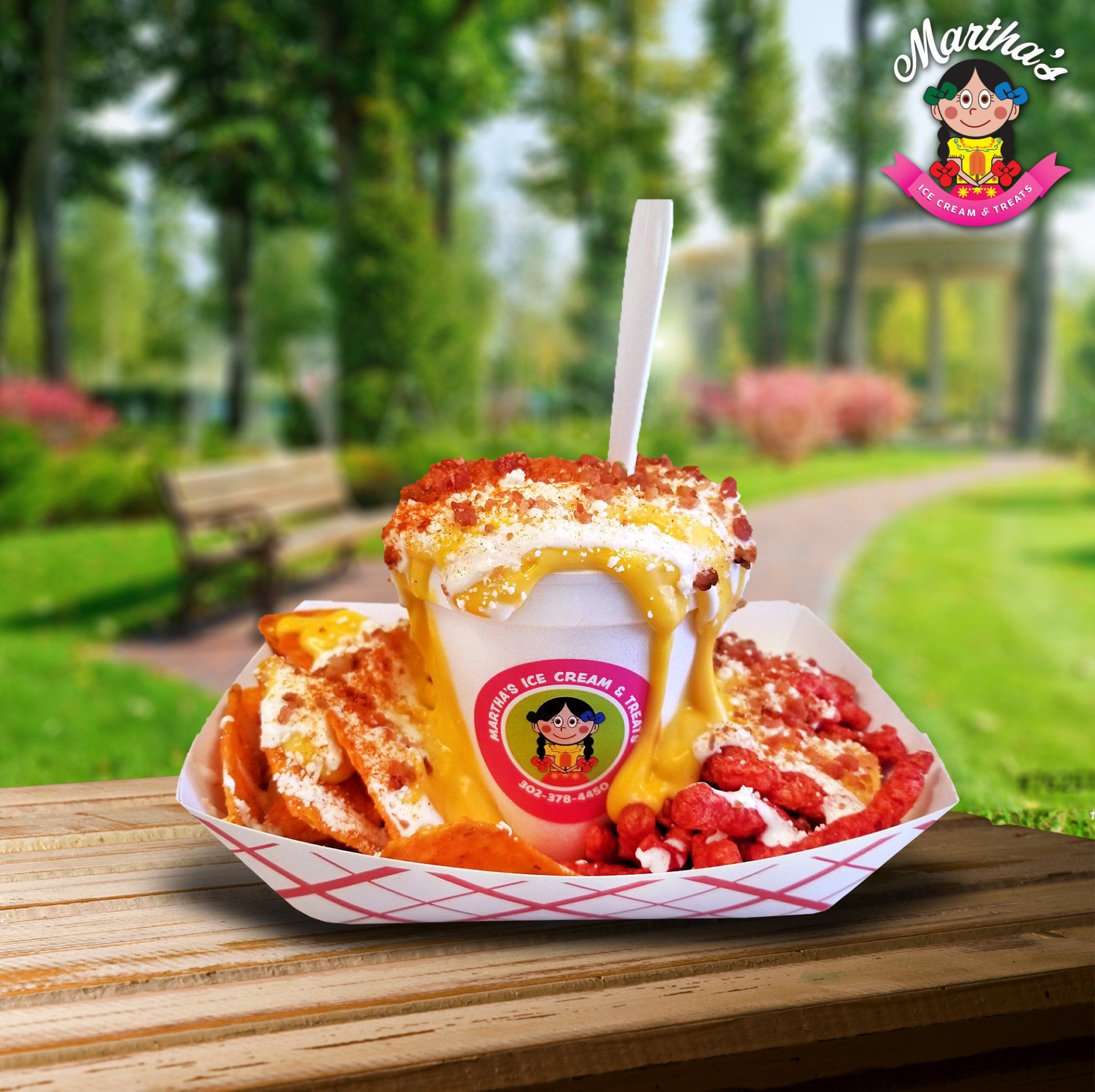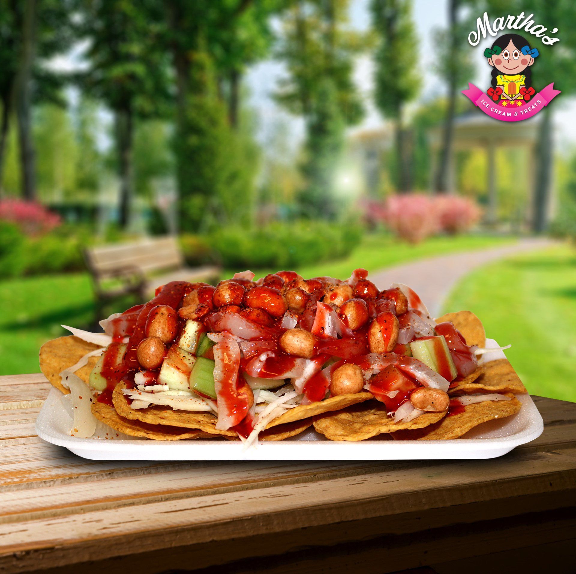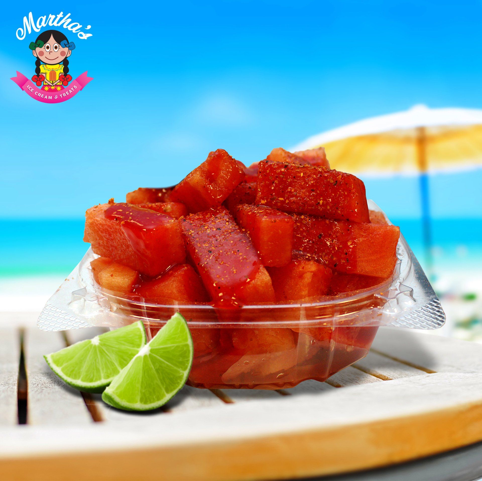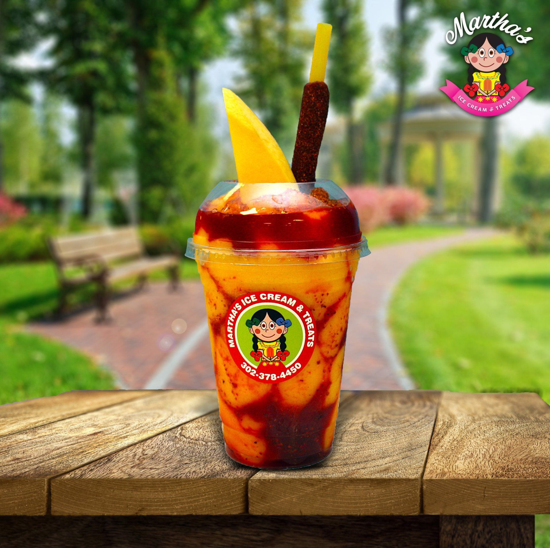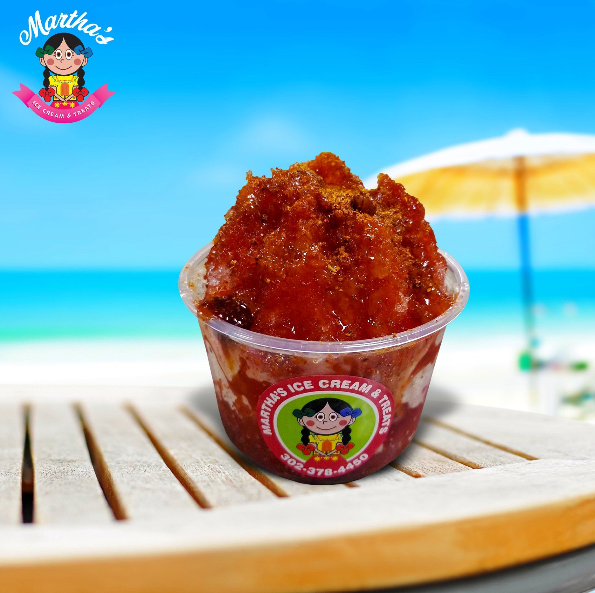 Hielo, pulpa de sabor a su gusto, chamoy, tajin, fruta fresca a su gusto, dulce de tamarindo.