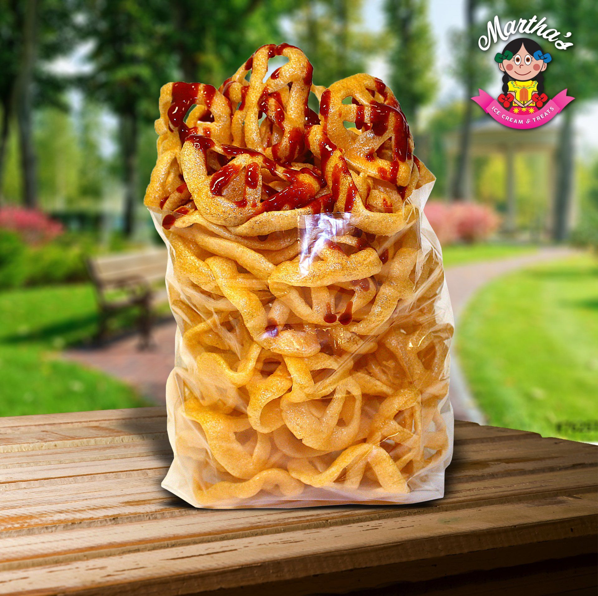 Crushed ice, pulp of your choice, sour sauce, chili powder, piece of fresh fruit of your choice, tamarind candy.