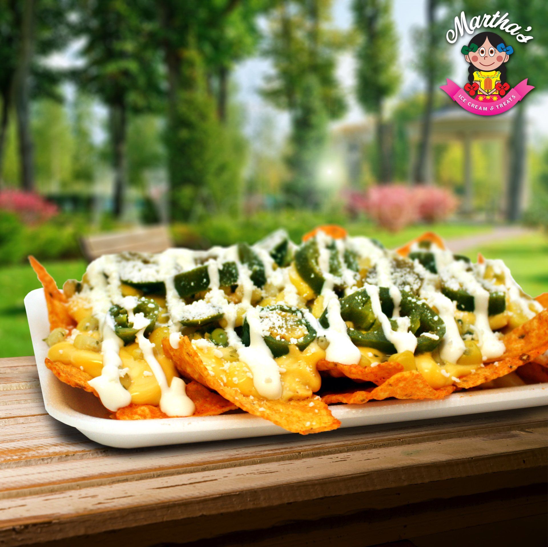 Corn, mayo, sour cream, butter, cotija cheese, chili powder, melted cheese, chips of your choice, topped with bacon.